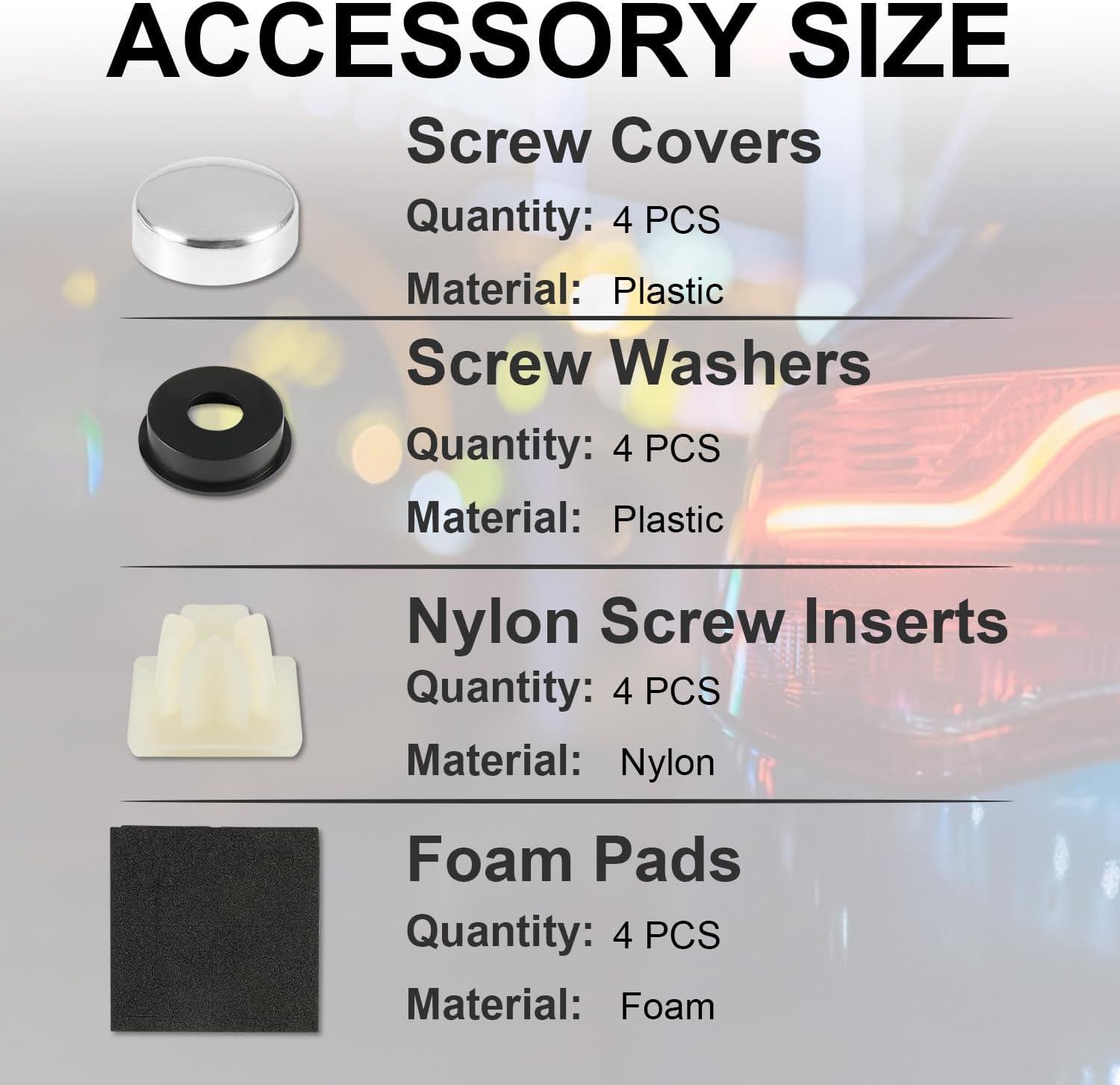 What You Get: Premium stainless steel screws–4pcs, foam pad–4pcs, screw washers–4pcs, screw covers–4pcs, nylon screw inserts-4pcs. M6 anti-theft screwdrive plum-shaped special wrench.