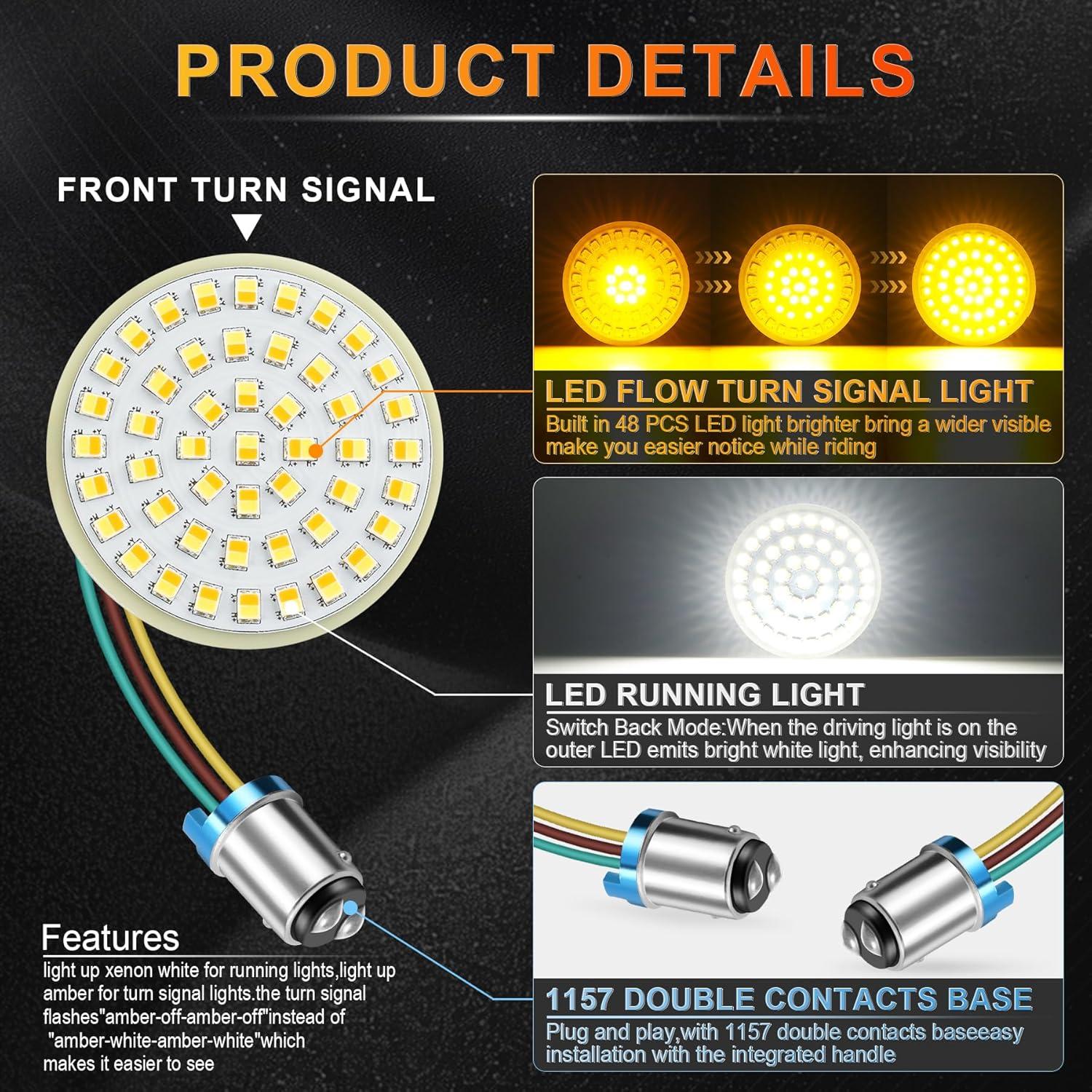 【Wide Compatibility】Compatible with Harley-Davidson models from 1986 to 2024, this LED turn signal features 1157 double contact bulbs and is designed for 2-inch bullet-style applications. Fits for Dyna, fits for Softail, fits for Touring, fits for Sportster, and more. Upgrade your ride effortlessly and give your bike a fresh, vibrant look.