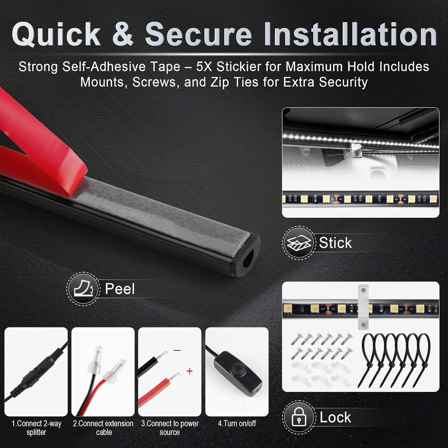【Simple Installation】 High adhesive 3M backing, simply peel and stick to allow the truck bed light strip to be securely installed. The two-way splitter easily connects to your truck's electrical system, while the switch provides convenient control. The blade fuse ensures that the system is protected, giving you peace of mind while driving.